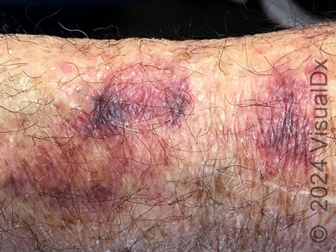 Look for dark-red-to-purple macules (small, flat areas of skin color changes) and patches (flat areas of skin color changes larger than a thumbnail) on the arms, backs of the hands, legs, and sometimes the face and neck. You may or may not recall previously bumping the affected area of skin.